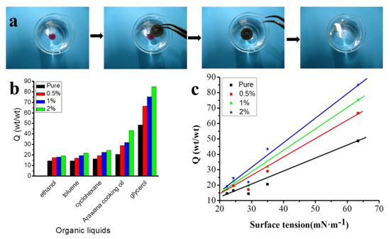The absorption capacities (Q) of the GIAs were measured by immersing them into and removing them from various organic solvents and oils with different surface tensions, including ethanol, toluene, cyclohexane, Arawana cooking oil and glycerol. The weight measurements of the wet GIAs should be performed quickly to avoid the evaporation of absorbed organic liquids. Q was calculated according to the following equation: