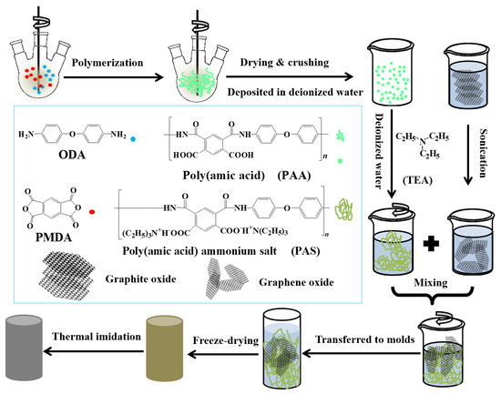 4,4′-Oxydianiline (4,4′-ODA, 99.8%, CAS: 101-80-4) and pyromellitic dianhydride (PMDA, 99.5%, CAS: 89-32-7) were purchased from Beijing Chemical Reagents Company (Beijing, China). Triethylamine (TEA, 99.0%, CAS: 121-44-8) and N,N-dimethylacetamide (DMAc, 99.5%, CAS: 127-19-5) were purchased from Beijing Chemical Works (Beijing, China). Graphite oxide (CAS: 149-91-7) was purchased from Nanjing Xianfeng Nanomaterials Technology Co., Ltd. (Nanjing, China). Deionized water (CAS: 7732-18-5) was used in the experiments. All of the chemical reagents were used without further purification.