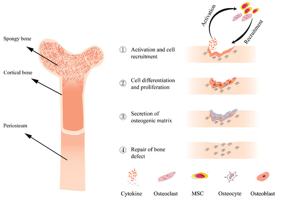 Bone is a highly dynamic and complex organ, and the balance between bone formation by osteoblasts and bone resorption by osteoclasts is well-coordinated under healthy physiological conditions [19,20]. Bone resorption is very important for maintaining mineral homeostasis, regulating function and bone defect healing, and is mainly affected by the number of osteoclasts [21]. However, this equilibrium is disturbed by many bone diseases such as trauma, infection and tumors. Bone defects refer to the loss of bone substance and are mainly manifested as the destruction of bone integrity, pain at the defect site and limited mobility. The repair of bone defects is a continuous process involving a series of biological events and a variety of osteogenic-associated cells (Figure 1). Often, bone defects are caused by various reasons, then inflammation develops at the site of the bone defect. This process produces a large number of cytokines, such as proinflammatory interleukins (IL-1, IL-6, IL-11 and IL-18) and tumor necrosis factor-α (TNF-α), that are involved in inflammation [22]. Various osteoblast-associated cells such as osteoclasts and mesenchymal stem cells (MSCs) are activated by these cytokines and are recruited to the bone defect sites. These cells proliferate at the site of the bone defect, at which point the stem cells further differentiate into osteoblasts to promote osteogenic differentiation and angiogenesis near the fracture site. Together with the osteocytes present in the bone, these cells promote bone repair by secreting various osteogenic-related matrices such as glycoprotein, osteocalcin and type I collagen [23,24].