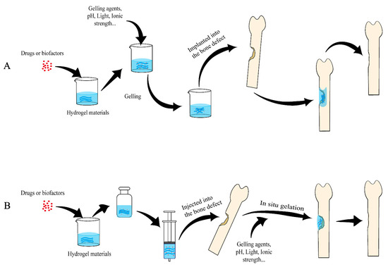 Schematic diagram of applying hydrogels as sustained-release drug carriers to repair bone defects. (A) Hydrogels formed in vitro being implanted into the bone defects. (B) Hydrogels formed in situ. Hydrogel materials are mixed with drugs and/or active biofactors (may also include cells) to form hydrogels and slowly release the drugs or biofactors locally to repair bone defects.