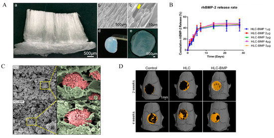 The HLC/HLC-BMP sponges for bone repair. (A) Gross view or SEM micrographs of the HLC/HLC-BMP sponges; (a) Gross view of the lyophilized HLC sponge, using a digital microscope at 30× magnification; (b,c) SEM micrographs of lyophilized HLC sponge at 100× and 500× magnification; Yellow arrow indicates the unique vertical pore structure of the HLC sponge; (d,e) Gross view of the HLC-BMP hydrogel. (B) Cumulative rhBMP-2 release kinetics from the lyophilized HLC-BMP sponges. (C) SEM images of MSCs attached in the HLC and HLC-BMP sponges after culturing for 4 h. (D) Micro-CT of the rat cranial defect repair after 2 and 4 weeks of implantation of hydrogels. Adapted with permission from Ref. [76]. Copyright 2022 Biomolecules.