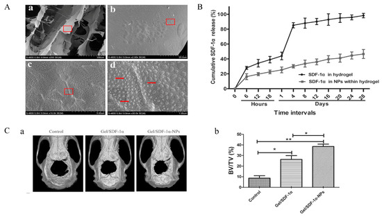 The SDF-1α/CS/CMCS NPs incorporated CS/GP hydrogels for bone repair. (A) SEM observation of SDF-1α/CS/CMCS NPs incorporated CS/GP hydrogels. (B) In vitro release of SDF-1α from CS/GP hydrogels and SDF-1α from SDF-1α/CS/CMCS NPs incorporated CS/GP hydrogels. (C) The micro-CT evaluation of in vivo bone formation. (a) Representative 3D reconstruction images of different groups. (b) Bone volume/total volume (BV/TV) varied in different groups (* p < 0.05, ** p < 0.01). Adapted with permission from Ref. [79]. Copyright 2022 International Journal of Bio-logical Macromolecules.
