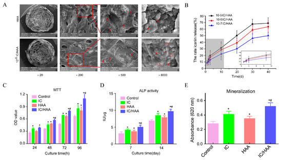The IC/HAA scaffold for bone repair. (A) The SEM images of the IC/HAA scaffolds. Red arrow indicates the nanohydroxyapatite. Red circle indicates the icariin. (B) HPLC detection of icariin release from IC/HAA composite scaffolds. (C) The optical density (OD) values of the MTT assays in the four groups. (D) ALP activity in each group. (E) Mineralization detected by measurement of the absorbance at 620 nm. Notes: * p < 0.05, compared with the control group, # p < 0.05, compared with the HAA group. Adapted with permission from Ref. [111]. Copyright 2022 International Journal of Nanomedicine.