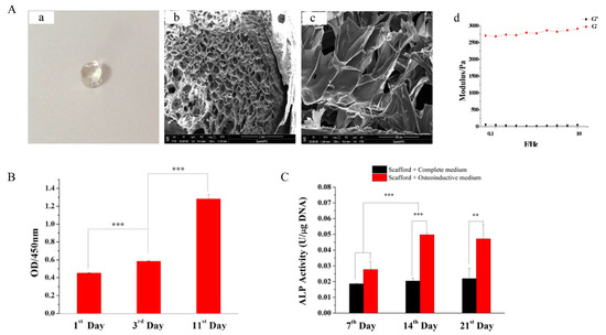 The HA-CS hydrogels for bone repair. (A) The morphology of HA-CS hydrogel (a–c), the storage modulus (G′) and loss modulus (G″) of hydrogel (d). (B) The proliferation of BMSCs within hydrogels at certain time intervals. (C) The ALP activity of BMSCs osteogenic differentiation within HA-CS hydrogels in different groups. Adapted with permission from Ref. [81]. Copyright 2022 Materials Science & Engineering C. ** p < 0.01, *** p < 0.001.