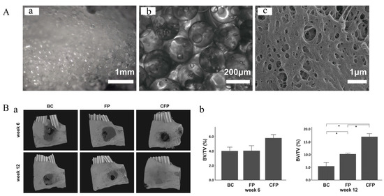 The FP scaffold for bone repair. (A) Morphology and structure of FP scaffold. (a) Stereomicroscopy image of FP scaffold. (b) Image of FP scaffold under an inverted microscope. (c) SEM image of FP scaffold. (B) Micro-CT evaluation of in vivo bone growth within harvested mandible samples. (a) Three-dimensional reconstructed images at week 6 and 12. (BC: Blank control, bone defect without implant; FP: Bone defect implanted with FP scaffold; CFP: Bone defect implanted with cell-laden FP scaffolds). (b) Results of quantitative analyses of samples harvested at weeks 6 and 12. The symbol * denotes a statistical significance between two groups (p < 0.05). Adapted with permission from Ref. [82]. Copyright 2022 NPG Asia Materials.