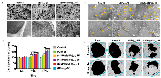 The SiNPs@NFs-SF hydrogels for bone repair. (A) SEM images of the Pure SF, (SiNPs@NF)5%-SF and (NFs) 5%-SF hydrogels. (B) The SEM images of adhesion and spreading of the MC3T3-E1 cells cocultured with the composite hydrogels (yellow arrows represent the cell nucleus). (C) The viability and proliferation of the MC3T3-E1 cells cocultured with the composite hydrogels, n = 5, * p < 0.05, ** p < 0.01. (D) Micro-CT images of rat cranial defects after implantation of the composite hydrogels for 1 and 3 months. Adapted with permission from Ref. [133]. Copy-right 2022 Advanced Healthcare Materials.