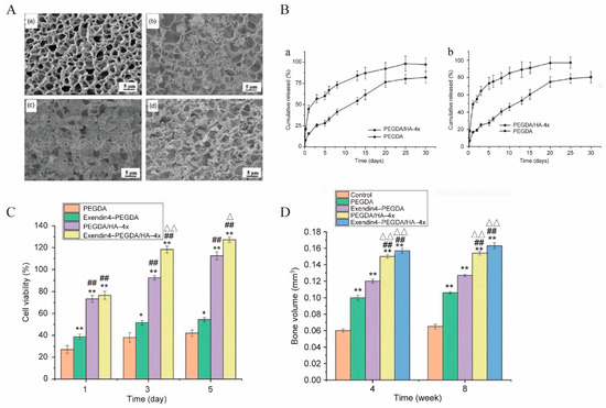 The PEGDA gel for bone repair. (A) SEM of PEGDA gel (a), PEGDA/HA-3x gel (b), PEGDA/HA-4x gel (c) and PEGDA/HA-5x gel (d). (B) Exendin4 cumulative release curve of PEGDA gel and PEGDA/HA-4x gel within 30 d; initial Exendin4 concentration was 5 μg/mL (a) and 10 μg/mL (b). (C) Proliferation of L929 cells grown on gel surface on 1, 3 and 5 d, and (D) new bone volume. (compared with the PEGDA, * p < 0.05 and ** p < 0.01; compared with Exendin4-PEGDA, ## p < 0.01; compared PEGDA/HA-4x group, Δ p < 0.05 and ΔΔ p < 0.01). Adapted with permission from Ref. [84]. Copyright 2022 Journal of Biomaterials Applications.
