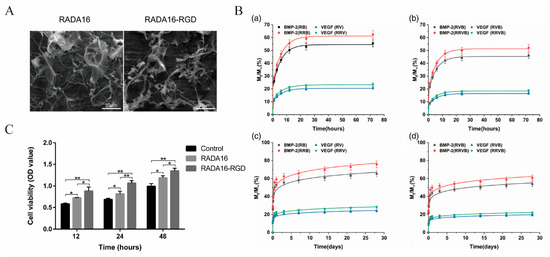 The RADA16 and RADA16-RGD hydrogels for bone repair. (A) The SEM images of RADA16 and RADA16-RGD. (B) Release profiles of growth factors in vitro. VEGF and BMP-2 released from (a) single-factor carriers and (b) dual-factor carriers during the first 72 h. VEGF and BMP-2 released from (c) single-factor carriers and (d) dual-factor carriers during the 28-day period. (C) Proliferation of cells on different samples evaluated by CCK-8 assay (n = 6, * p < 0.05, ** p < 0.01). Adapted with permission from Ref. [78]. Copyright 2022 Journal of Biomedical Materials Research Part A.
