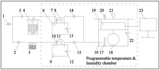 Based on Equations (4)–(8), a test system was constructed and is shown as Figure 1, which mainly consisted of air pump 1, moisture air generator 4 and its tank 6, dry air generator 5 and its tank 9, absorption chamber 16, electronic scales 19, data recorder 23, some valves (2, 3, 7, 10, 14, 15 and 20), pressor gages (8, 11 and 21) and sensors (12, 13 and 22). The effect of baffle 17 was to slow down the air flow. The parts surrounded by dotted lines were kept in the isothermal chamber during the test. Table 1 lists information of the main equipment.