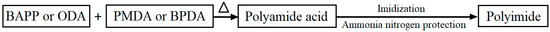 Figure 2 shows the synthesis process of the PI films. Firstly, binary anhydride and diamine with the same molar mass were put into DMAC, and stirred and heated to obtain PI acid. Different concentrations of PI acid were attained by changing the ratio of the total mass of binary anhydride and diamine, and the mass of DMAC. Then, the PI acid was dropped on a glass sheet gripped by a spin coater. Finally, the glass sheets were put into an electric furnace controlled by a program. The heat and imidization program were as follows: from room temperature to 100 °C for 40 min, 100 °C to 150 °C for 30 min, 150 °C to 200 °C for 30 min and 300 °C to 290 °C for an hour. According to the above method, four PI films were obtained, which were PO (PMDA-ODA), BO (BPDA-ODA), BB (BPDA-BAPP) and PB (PMDA-BAPP), with four concentrations of PI acid, respectively, of 23%, 20%, 17% and 15%.