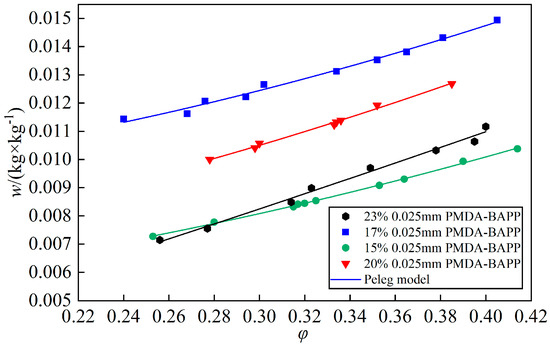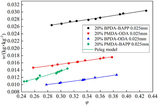 Four PI films with PI acid concentrations of 23%, 20%, 17% and 15% were prepared, respectively, which all had 0.01 m2 area and 0.025 m thickness. The test was conducted at 20 °C. Figure 7 shows the test results and their w(φ) curves coupled by the Peleg model. The w(φ) curves of the four films had a similar tendency of linear increase with relative humidity. The moisture absorption of PB film with 17% PI acid was the highest, which was 1.248 × 10−2 kg/kg in the test range, followed by 20%, 23% and 15% PI acids. This could have been caused by different porosities. It indicated that the moisture absorption of PI film depends on many factors, but not for PI acid concentration.