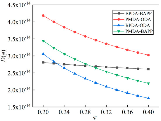 where D is the effective diffusion coefficient, m2/s; ρ is the performance density of PI film, kg/m3; w is the moisture mass percentage of PI film, kg/kg; φ is the relative environmental humidity at experimental temperature, % RH; and pvs is the saturated vapor pressure at experimental temperature, Pa.