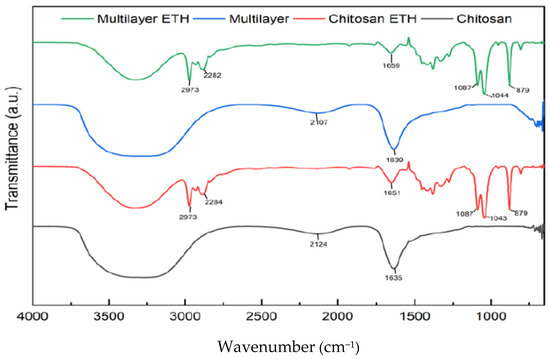 Dye leaching is another important parameter that was analyzed in monolayer and multi-layered intelligent films. According to the Food and Drug Administration, the most common food stimulants for fresh and refrigerated fish are water and ethanol. Chitosan and multi-layer film samples were soaked in the respective aqueous and ethanol solvents for 10 days. The leaching of RCE dye normally occurs in monolayer film samples. So, this test was carried out to verify and assure the safe use of the multi-layer intelligent film for food applications. Then, the FTIR analysis for both the dried films and the solution samples was performed. FTIR spectra were analyzed to verify or spot the presence of the functional group of the anthocyanins in both the dried film and the solution sample in which the film was soaked for 10 days. The FTIR analysis for the film was to ensure that anthocyanins from RCE were retained in both the monolayer and the multi-layer film. Similarly, FTIR analysis was performed for the residual solution to verify the leached anthocyanins into the solution when exposed to different food stimulants. Figure 4 shows the FTIR spectra of the RCE anthocyanin functional groups both from the dried film samples and the multi-layer sample. FTIR was employed to detect the anthocyanin functional groups in ethanolic plum extracts [41]. The film samples were incorporated with anthocyanin extract from RCE, and the dye leached in residual solutions could have similar functional groups, as shown in Figure 4. When the monolayer chitosan film was soaked in ethanol and water solutions for 10 days, the FTIR result of the monolayer film in both the stimulants showed that anthocyanins were leached out during the soaking process. As can be observed from Figure 4, the solution sample of chitosan film in water showed the presence of two distinct peaks at 2877.14 cm−1 and 3267.01 cm−1, indicating the stretching vibration between N-H and O-H bonds due to the interaction between the chitosan and the anthocyanin. When the same chitosan film was soaked in the ethanol solution, shifts in the chitosan peaks were observed at values from 3291.31 cm−1 and 1027.05 cm−1 to 3330.98 cm−1 and 1053 cm−1, respectively. The presence of the peaks at 3418 cm−1, 1639 cm−1 and 1053 cm−1 showed the possibility of the presence of the functional groups of anthocyanins [42]. Comparing Figure 4, the FTIR analysis of the solution samples of the monolayer chitosan film showed similar peaks, so we can conclude that the anthocyanin dye incorporated into the monolayer film was leached out in both types of stimulants. FTIR spectra were evaluated in the gelatin-based intelligent film in which the addition of sappan (Caesalpinia sappan L.) heartwood extract can form a hydrogen bond with a related functional group to reduce free hydrogen that can form hydrophilic bonds with water [39].