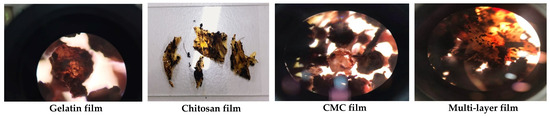 Photographs of disintegrated monolayer gelatin, chitosan and CMC films and multi-layered film observed under an optical microscope.
