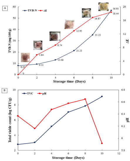 TVB-N value is widely used as a quality parameter to evaluate the freshness of fish and meat products [50]. The average rejection limit of TVB-N for fish ranges between 20 and 30 mg/100 g depending on the composition of samples [51]. This further instigates that the rejection level in its lower limit for TVB-N in fishes is 20 mg/100 g. As shown in Figure 6A, TVB-N content increased from 8.05 mg/100 g on day 0 to 13.06 mg/100 g on day 4 of refrigerated storage; the sample experienced slow degradation with lower microbial load and was approved for safe consumption. However, after 6 to 10 days of storage, TVB-N amount exceeded the rejection limit, from 21.23 mg/100 g to 56.39 mg/100 g. The multi-layer intelligent film color was in accordance with the results of the pH sensitivity test in which a yellow color was attained in high pH conditions. Thus, TVB-N content was correlated with a change in pH and the degradation of fish muscles releasing basic nitrogen volatile compounds to be sensed by the color differences in RCE in the intelligent multi-layer film during 10 days of storage. The trimethylamine (TMA), dimethylamine (DMA) and ammonia (NH3), collectively known as total volatile basic nitrogen, were detected using plastic film incorporated with bromophenol dye as a pH-sensing indicator of fish freshness, placed in the head space of the package, showing a gradual color change and increased bacterial load during fish spoilage [52].