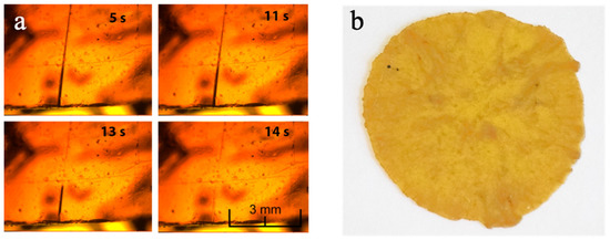This means that a cut in the material can be easily and readily repaired just by putting in contact the two surfaces at room temperature or in neutral-to-mild conditions. This is made possible by the dynamic nature of the aromatic disulfide bridges, which can undergo exchange reactions at room temperature through a radical mediated [2+1] mechanism [34]. This property was directly investigated by monitoring the evolution of a small cut on a thin film of HMDO-ADS by optical microscope (40× magnification) at room temperature. The images acquired as a function of time, reported in Figure 4a, show the progressive disappearance of the fracture line of HMDO-ADS sample, evidencing the rapid self-healing process that ends within about 14 s. For sake of comparison, the same experiment was carried out on and HMDO-DAE which, in contrast to HMDO-ADS, did not show any healing of the cut.