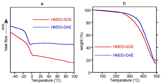 DSC curves (a) and thermograms (b) of HMDO-ADS and HMDO-DAE.