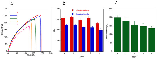 HMDO-ADS mechanical properties. Representative stress-strain curves of HMDO-ADS sample obtained in subsequent four healing cycles (a). Young modulus, tensile strength (b) and strain at break (c) as a function of cycle number.