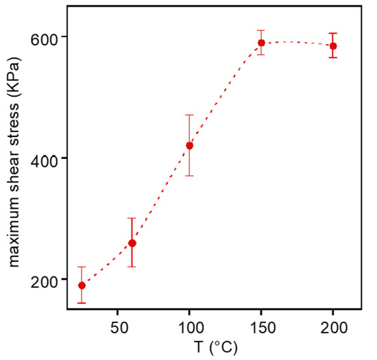 Then, lap joint shear tests were carried out to investigate the adhesive performances of HMDO-ADS. Preliminary tests were carried out to find the optimal temperature to prepare the specimens. In Figure 9, the maximum shear strength is reported as a function of the temperature used to press at 360 KPa HMDO-ADS between the two etched copper strips.