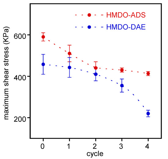 The strength trend of the joint prepared with HMDO-ADS shows a slight decrease in each subsequent experiment. Moreover, the failure mode is always cohesive. On the other hand, the maximum shear strength of the lap joint obtained with HMDO-DAE undergoes a progressive and considerable decrease, failing constantly at the interface between polymer and metal.