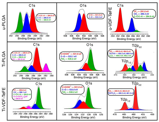 In the C1s spectrum of the u-VDF-TeFE scaffold, two peaks are present, with maxima at 286.3 and 291 eV that correspond to the molecular groups of CH2 (marked in blue) and CF2 (red), respectively [49,50]. Spectrum deconvolution shows an additional third peak at 284.6 eV, which corresponds to the molecular groups of C–C and C–H (marked in green) [51]. Deconvolution of the Ti-VDF-TeFE C1s spectrum identifies four molecular groups, three of which are also represented by the u-VDF-TeFE scaffold. These are the molecular groups of CF2, CH2 and C–C/C–H, which are observed at the binding energies of 290.8, 286.1 and 284.8 eV, respectively. The fourth peak at the binding energy of 288.8 eV (highlighted in pink) corresponds to the functional groups O–C=O/CF2–CHF [52].