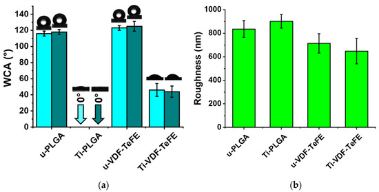 Water contact angles (WCA) and roughness of u-PLGA, Ti-PLGA, u-VDF-TeFE and Ti-VDF-TeFE scaffolds: (a) WCA values after 2 s of liquid contact with the scaffold’s surface (marked in cyan) and after 1 min (marked in dark cyan); (b) roughness values (marked in light green). The WCA of Ti-PLGA scaffolds is shown as 0°. All values are shown as mean ± SD.