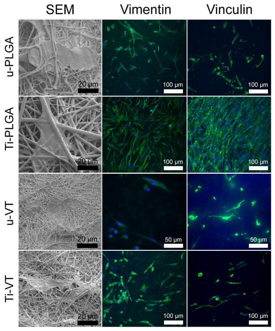 SEM micrographs of human gingival fibroblasts (on the left) and optical fluorescence micrographs of u-PLGA, u-VDF-TeFE, Ti-PLGA and Ti-VDF-TeFE after 48 h of cell cultivation. Under fluorescent light, the nuclei of the cells appear blue due to staining with DAPI, and the cytoplasm of the cells appears green due to antibody labeling with vimentin (in the middle) and vinculin (on the right) and staining with fluorescence dye Alexa488 (see Section 2.2 for more details).