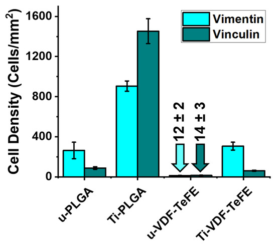 Number of cells per area (cells/mm2) on u-PLGA, u-VDF-TeFE, Ti-PLGA and Ti-VDF-TeFE scaffold samples for both types of both utilized antibodies to labelling the primary human gingival fibroblasts with Alexa488 for fluorescence staining (vimentin—cyan, vinculin—teal).