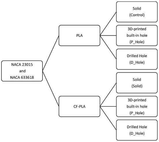 With the purpose of assessing the compression strength and consequent delamination of 3D-printed rib specimens, a set of different samples was designed for comparing different features that may be involved in the propagation of delamination when a certain 3D-printed rib specimen is subjected to compression. The first approach is to assess the compression strength of a simple solid specimen to characterize the elastic behavior and ultimate strength that will be used as a control case. As mentioned above, ribs with airfoil profiles usually have various features used as free spaces for wiring or hydraulic systems, in addition to the holes near the gravity center. The airfoil profiles considered for the set of rib samples were NACA 23015 and NACA 633618, which are airfoil geometries often used in aerodynamical structures for wind turbine blades. These airfoils were 3D printed with PLA and PLA with short carbon fiber additives (CF-PLA), and eventually each of the sets was sorted as solid (control), originally 3D-printed built-in hole (P_Hole), and machined with a drilled hole (D_Hole), as Figure 1 shows.