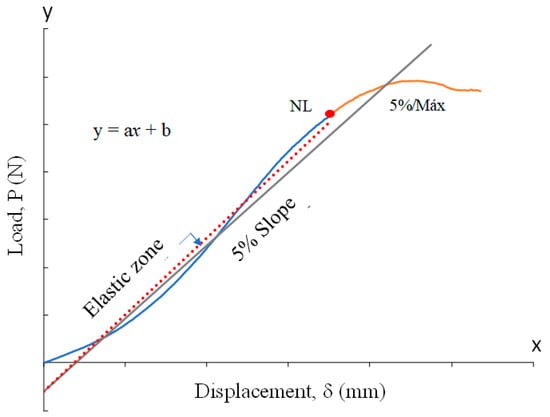 One of the innovations that this work offers is that the propagation of fractures was partially calculated by following the ASTM 5528 standard [56], which measures the Mode I interlaminar fracture toughness for laminated composite materials, as Figure 5 shows. This consisted of drawing an approximately right line throughout the elastic zone from the non-linear point (NL) or the point where the linearity is no longer evident to the origin or the interception with the ordinate axis; this line is represented by regression with a general equation, as Equation (1) shows: