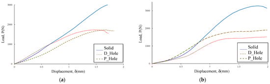 Once the raw data were recorded, curves per specimen were plotted and the NL point and the 5%/max point were determined. For instance, Figure 6 shows typical plots for each airfoil NACA 23015 sample. As it is observed, the slopes of each sample are consistent, however, the maximum linear peak (NL) is different, and in some cases, the non-linear peak is slightly diffuse, as the plot describes a long curve. In general terms, the solid sample shows a significantly higher NL point in comparison to the D_Hole and P_Hole, as expected, given that this sample has no deleterious holes that decrease the compression strength, though this sample shows similar elastic behavior properties to the others. As observed in the case of the PLA sample, the D_Hole sample appears to be higher than the P_Hole sample in contrast with the CF_PLA, where the P_Hole sample is clearly higher than the D_Hole sample. This change in behavior between samples might be attributable to the effect of drilling, hence abrasion and heat on the resin additives that apparently are more susceptible to interlayer damages.