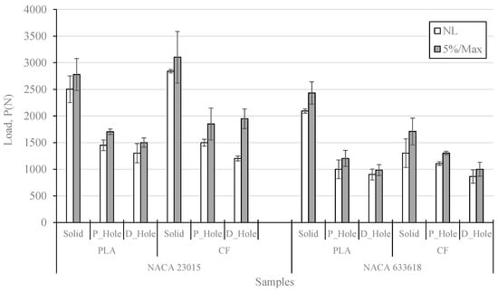 Figure 7 shows the comparison of NL and 5%/max values for all the studied samples, where each bar represents a certain average value, and its respective error bar represents a 95% confidence interval. As expected, the solid samples for both types of airfoils show higher maximum loading values with a clear preponderancy by the NACA 23015, and this trend is also valid for all the remaining samples. Thus, the type of geometry might have an effect on the distribution of stresses along the specimen, with areas with higher accumulation of stresses by the NACA 633618. In general terms, the carbon fiber additives induced an increase in NL and 5%/max values in all the NACA 23015 samples, whereas this trend is not too clear for the NACA 633618. However, it is obvious that a drilling manufacturing process induces higher delamination damages than a hole manufactured by 3D printing, according to the data shown by all the samples, as mentioned above. The differences between NL and 5%/max are higher for NACA 23015 (≈350 N) than for NACA 633618 (≈220 N), which suggests that in the first airfoil the propagation of delaminations needed more compression energy to be carried out; this is consistent with a greater distribution of stresses along the specimens, as previously described. This propagation of delamination appears to be more unstable for CF_PLA samples, as they show higher variabilities; thus, it can be implied that while the carbon fiber additives induce higher reinforcement for fracture propagation, these additives also induce instabilities in such propagations, and this is noticeable in the solid samples of both airfoils.