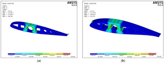 Von Mises stress distribution on PLA samples: (a) NACA 23015; (b) NACA 633618.