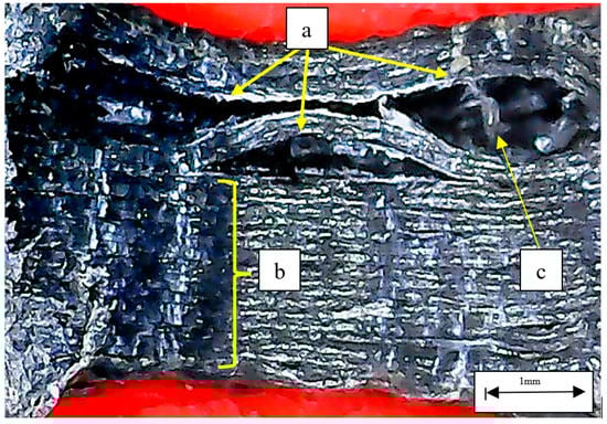 Central hole cross-section of NACA 633618 -CF_PLA-D sample: (a) delamination at the central hole; (b) damages caused by drilling; (c) bead-bridging mechanism.
