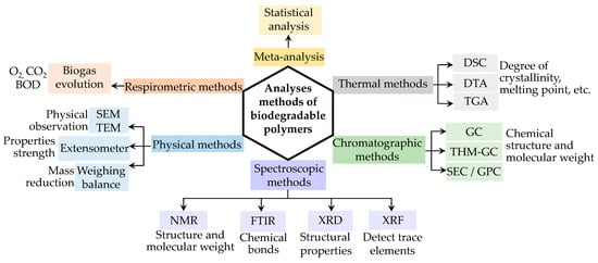 The compositional data and remaining products of biopolymers often provide useful clues for the prediction of the materials’ biodegradability and physical properties. These benefits have led to a growing demand for the accurate and precise determination of the biodegradable polymer composition. Both qualitative and quantitative analyses of biodegraded materials are possible. Among these approaches are physical methods, respirometric, chromatographic, and spectroscopic methods, and meta-analysis. Among these methods, chromatographic methods are the most frequently utilized characterization techniques. Their applications and limitations are discussed below.