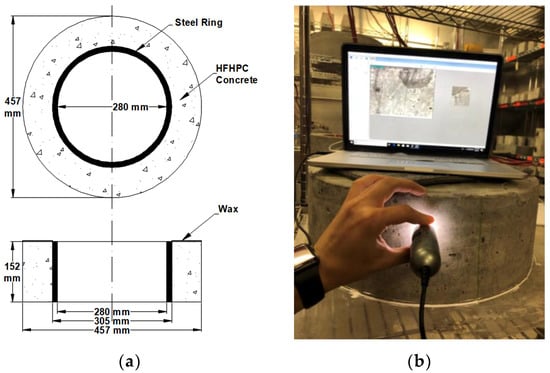 The AASHTO T334 ring test [30] was the primary test utilized to measure and quantify the cracking of the trial mixes. The test consists of an inner steel ring with four foil strain gauges attached to its inner surface, with an concrete ring cast around the outer surface of the steel ring. The dimensions of the ring are illustrated in Figure 1a. The inner steel ring restrains the concrete from shrinking, and as a result, a hoop tensile stress is induced in the concrete test sample. If this stress exceeds the tensile strength of the mix, the concrete begins cracking. The AASHTO T334 standard states that any mix that does not develop a full crack within the testing period is deemed adequate for restrained shrinkage applications.