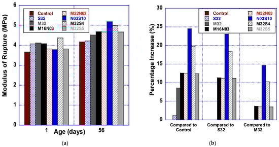 Modulus of rupture (a) testing results and (b) percentage increase compared to control mixes (Control, S32, M32).