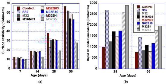 Durability performance of HFHPC: (a) surface resistivity (kΩ-cm) and (b) rapid chloride permeability (Coulombs).