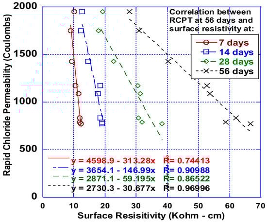 Figure 5 illustrates the correlation between the chloride permeability and surface resistivity results. The correlation attempts to predict the rapid chloride permeability of the HFHPC at 56 days by using the surface resistivity measurements at 7, 14, and 28 days. This correlation could assist transportation agencies to approve mixes prior to 56 days, based on the surface resistivity measurements.