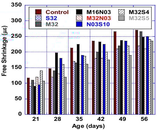 Three free shrinkage tests were prepared as per ASTM C157 (75 × 75 × 285 mm prisms) and tested for each mix, with average values reported. As presented in Figure 6, the HPC control mix experienced significantly higher shrinkage than all other mixes. Among all mixes, S32 and M32N03 exhibited the lowest free shrinkage strain, an improvement of up to 18.5% and 22% as compared to the control mix. M32 exhibited the least shrinkage improvement at 1.8%; however, results do show that when macro polypropylene fiber is combined with micro polypropylene or steel fibers, shrinkage decreases significantly. The graph illustrates that the addition of micro polypropylene fibers to M32 resulted in lowering free shrinkage up to 21% (M32N03) and the addition of steel fibers (M32S5) resulted in an 11% improvement. In general, utilizing fiber hybridization reduces the free shrinkage of HPC, with the rate of improvement depending on the fiber types utilized.
