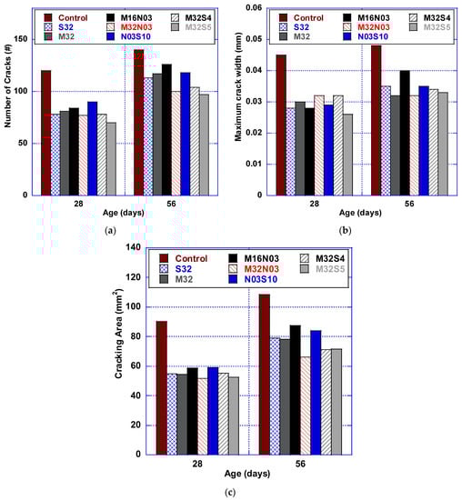 Figure 7a quantifies the number of cracks resulting from all concrete mixes. The HPC control mix exhibited the highest number of cracks at 56 days. When compared with the HPC control mix at 56 days, S32 and M32 reduced the number of cracks by 19.3% and 16.8%. When micro and macro polypropylene fibers are combined (M32N03) and compared to M32 at 56 days, the number of cracks was further reduced by 14.6%. In addition, by adding steel fiber to macro polypropylene fiber, mixes M32S4 and M32S5 were also successful in reducing the number of cracks up to 10.7% and 16.7%, respectively, when compared to M32.