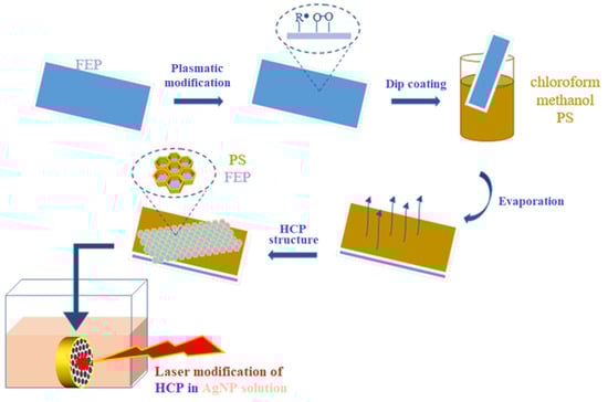 In this experiment, we suggested a very simple and robust technique for large-scale patterning with polystyrene honeycomb units followed by silver immobilization from a silver nanoparticle solution supported by excimer laser treatment. The polystyrene honeycombs were successfully constructed of perfluorinated substrate, FEP, activated with argon plasma. The immobilization obtained from the solution was then successfully applied to the polystyrene HCP structure. This technique can be extended to other aromatic polymers, such as polycarbonate, which are able to interact with an excimer laser wavelength. The application of surface-immobilized polymers can be predominantly observed in SERS analysis, but also as constructs for soft and hard tissue engineering and in the construction of antibacterial surfaces.