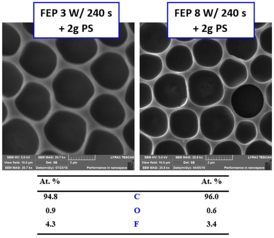 Figure 3 presents the surface morphology of the FEP foil prior to and following the preparation of the honeycomb pattern. The creation of honeycomb patterns is described in the IPS method, which is based on the presence of methanol in a binary mixture of organic solvents. Methanol substitutes for a humid environment, stabilizes water droplets, and guarantees the creation of a regular pattern. Plasma treatment slightly increased the surface roughness; thus, the surface chemistry was significantly altered []. The enlarged image of the plasma-modified sample presented a wrinkled structure on the FEP surface. Images of the samples treated at a high power (8 W) and for a long exposure time (240 s) were selected for further experimentation. The formation of the honeycomb film significantly increased in surface area (121.0%) and roughness Ra (333.0 nm), as expected. The pores were circular and regularly arranged. The effect of different plasma-power values (3 and 8 W) at the same modification time (240 s) on the pore size and shape and the corresponding chemical surface compositions are presented in Figure 4. Circular-shaped pores were created. The results of the elemental analysis of these patterns are presented in Figure 4. The values listed in the table show that the chemical composition does not change when using different plasma discharges, and oxygen concentration significantly increases when compared to pristine FEP [].