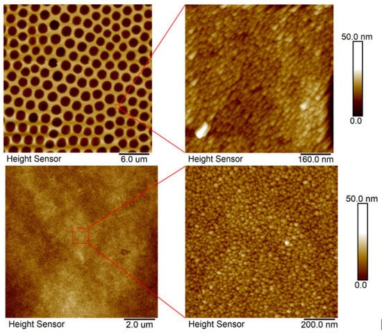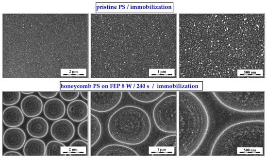 As stated above, the preparation of the primary honeycomb polystyrene layer was based on an improved phase-separation technique in combination with dip coating; the process is described in detail in []. We aimed to immobilize noble metal nanoparticles into this structure, on the basis of the excimer exposure of the sample, which was immersed in the nanoparticle solution. The immobilization can be performed also on polymer without the honeycomb pattern. The key element is the aromatic core, so that it may interact with the applied excimer wavelength (248), the excimer exposure guides the immobilization process. One has to point out that the plasma treatment is a crucial step for primary surface modification (construction of honeycombs prior to further excimer exposure), which induces surface physico-chemical changes in FEP, changes its morphology and wettability properties, while the contact angle decreases [,,]. The morphology of laser-immobilized samples of polystyrene honeycomb patterns is presented in Figure 5 (first line) for two different scanning areas. For the purpose of comparison, the results obtained from the immobilized polystyrene pristine samples are introduced in the bottom line of Figure 5. The immobilization process is successful, and the honeycomb structure is covered with globular noble metal nanostructures, as it is evident from the images on the right-hand side of Figure 5.