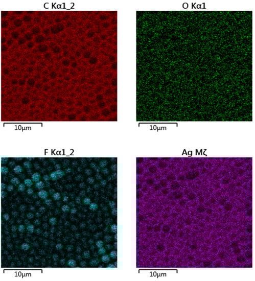 EDS mapping channels for carbon, oxygen, fluorine, and silver of the immobilized honeycomb polystyrene pattern; 30 micron scans are presented.