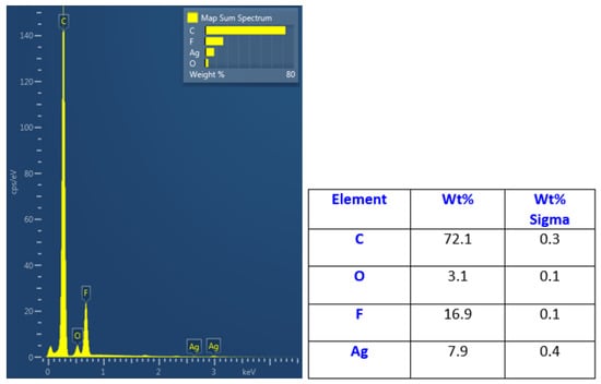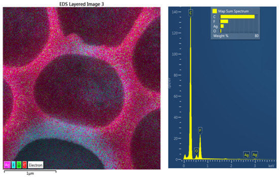 The elemental composition of the immobilized honeycomb structure is presented in Figure 8. It is evident that the immobilization led to a significant increase in silver concentration in the upper layers of the honeycomb structure. The EDS method is able to provide information from several hundreds of nm; therefore, it can be expected that the surface is even more enhanced by silver nanoparticles. They also diffuse during the immobilization process into the bulk material, thus forming an Ag–polymer composite, as previously described by Siegel et al. []. The 8 wt.% concentration confirmed the high immobilization ratio and thus the possibility to apply the abovementioned technique for this type of polymer and polymeric structures. Moreover, we also applied EDS mapping to one honeycomb unit, as is presented in Figure 9. We confirmed the homogeneous elemental distribution of Ag and the concentration of silver to be approx. 8 wt.%, which is the same value as for large-scale mapping presented in Figure 7. It is obvious that the signal produced by the immobilized silver nanoparticles is collected from the area almost homogeneously (purple), which confirms the success of the immobilization process. Some minor areas presented less uniform or homogeneous immobilization, but the whole surface was still enhanced by silver.