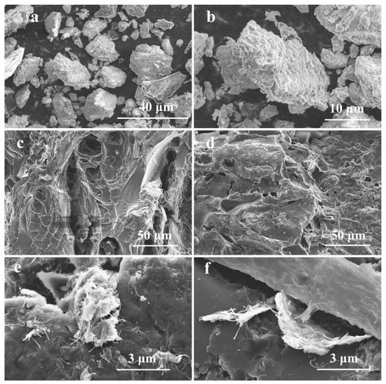 SEM images of AC under different magnifications (a,b), GO/AC composites (c), GO-CNT/AC composites (d), high magnification images of GO-CNT/AC composites (e,f).