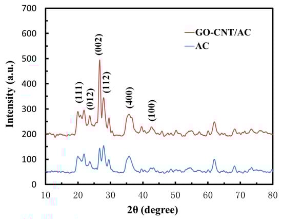 The crystal structure of AC and GO-CNT/AC composites was studied by X-ray diffractometer with a wavelength of 0.154 nm. The XRD spectra of the AC and GO-CNT/AC composites are shown in Figure 2, which reveal the characteristic peaks at 2θ = 20.7°, 23.6°, 26.1°, 27.9°, 35.8°, and 42.4°, corresponding to (111), (012), (002), (112), (400), and (100), respectively [33]. Especially, compared to raw AC, after combined with the CNTs and GO, the (002) peak of the composites at 2θ = 26.1° is strongly enhanced. This is because the (002) crystal plane of CNTs also produces a strong diffraction peak at the same position, thus obviously increase the intensity of this peak. In addition, the average crystallite size (La, Lc) and the graphitization degree (g) of the composites can be calculated using the following formula [34]: