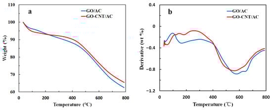 The thermal stability analysis of GO/AC and GO-CNT/AC composites was determined in a N2 atmosphere at a heating rate of 10 °C/min from 30 °C to 800 °C. The TG and DTG curves are shown in Figure 5. The weight loss ratios of the GO/AC and GO-CNT/AC composites are 37.6% and 34.5%, respectively. The weight loss of the GO-CNT/AC composites can be divided into three stages. Below 200 °C, it is mainly due to the thermal decomposition of the oxygen-containing functional groups on the surface of CNTs and GO. The loss rate in this stage peaked at 181.9 °C. At the temperature range of 200–400 °C, it is mainly due to the slow decomposition of the carbon material skeleton, with a lower loss rate. It can be seen from Figure 5b that a large amount of weight loss occurred between 400 and 700 °C. At this stage, the test temperature gradually exceeds the preparation temperature of AC, with the discharge of hetero-atoms and the rearrangement of carbon atoms in the carbon matrix. The original crystal structure disintegrates, and some of the components are taken away by the carrier gas, resulting in the reduction of the sample mass. The weight loss rate reaches the maximum at 562.2 °C, and then gradually decreases with the increasing temperature. However, the weight loss is still in progress at 800 °C, which indicates that the phase structure of the composites still has not reached stability. Furthermore, combined with the XRD testing results in Table 1, both the AC and GO-CNT/AC composites have low graphitization degree and small crystalline size, which also reduces their stability at high temperature. The weight loss of GO-CNT/AC composites at 200~800 °C is 27.1% of the total weight, smaller than that of GO/AC composites, which is 30.2%. According to the results of the TG analysis, CNTs improve the thermal stability of the composites, which expands the application fields of GO-CNT/AC composites for adsorption at higher temperatures.