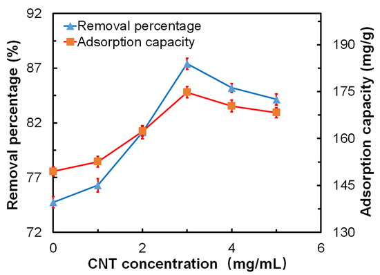 The GO-CNT/AC composites were synthesized with different CNT concentrations, and then, 100 mg of GO-CNT/AC composites were immersed into 100 mL of MB solutions with a concentration of 200 mg/L, pH value of 7, and absorption time of 300 min for the adsorption investigation. To make a comparison, the adsorption property of raw AC is also tested under the same conditions. The influence of the CNT concentration on the removal percentage and adsorption capacity of the composites was investigated and shown in Figure 7. The CNT concentration referred to the content of CNTs in the GO-CNT solution which was used to prepare GO-CNT/AC composites. The CNT concentrations were set as 0, 1, 2, 3, 4, and 5 mg/mL, respectively, as described in Section 2.4. In this study, when the CNT concentration increases from 0 mg/mL to 3 mg/mL, the MB removal percentage of GO-CNT/AC composites increases from 74.7% to 87.4%, and the MB adsorption capacity of GO-CNT/AC composites increases from 149.5 mg/g to 174.8 mg/g. Compared with the raw AC material, the removal percentage is 55.2% and the adsorption capacity is 109.8 mg/g, which are increased by 58.3% and 59.2%, respectively. When the CNT concentration is higher than 3 mg/mL, both the removal percentage and the adsorption capacity of the composites start to decrease. The reason is that at relatively lower CNT concentration, the GO sheets are linked to the surface of AC through the CNT “spring”, which plays a supporting role in exposing the surface of the GO sheet, and further increasing the specific surface area of the whole system. Moreover, the above composites contain a large number of negatively charged adsorption sites and micropores, which greatly increase the adsorption performance of the composites mainly based on electrostatic adsorption and microporous adsorption. When the CNT concentration is too high, it tends to agglomerate between the GO sheets and on the AC surfaces, which can further block the pores of the AC matrix, thus reducing the adsorption property of the GO-CNT/AC composites.